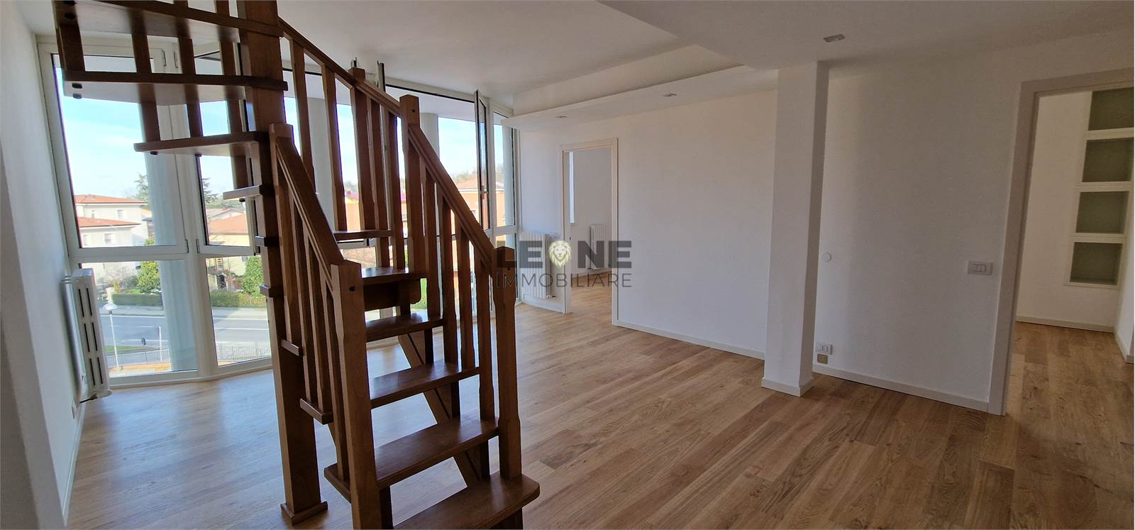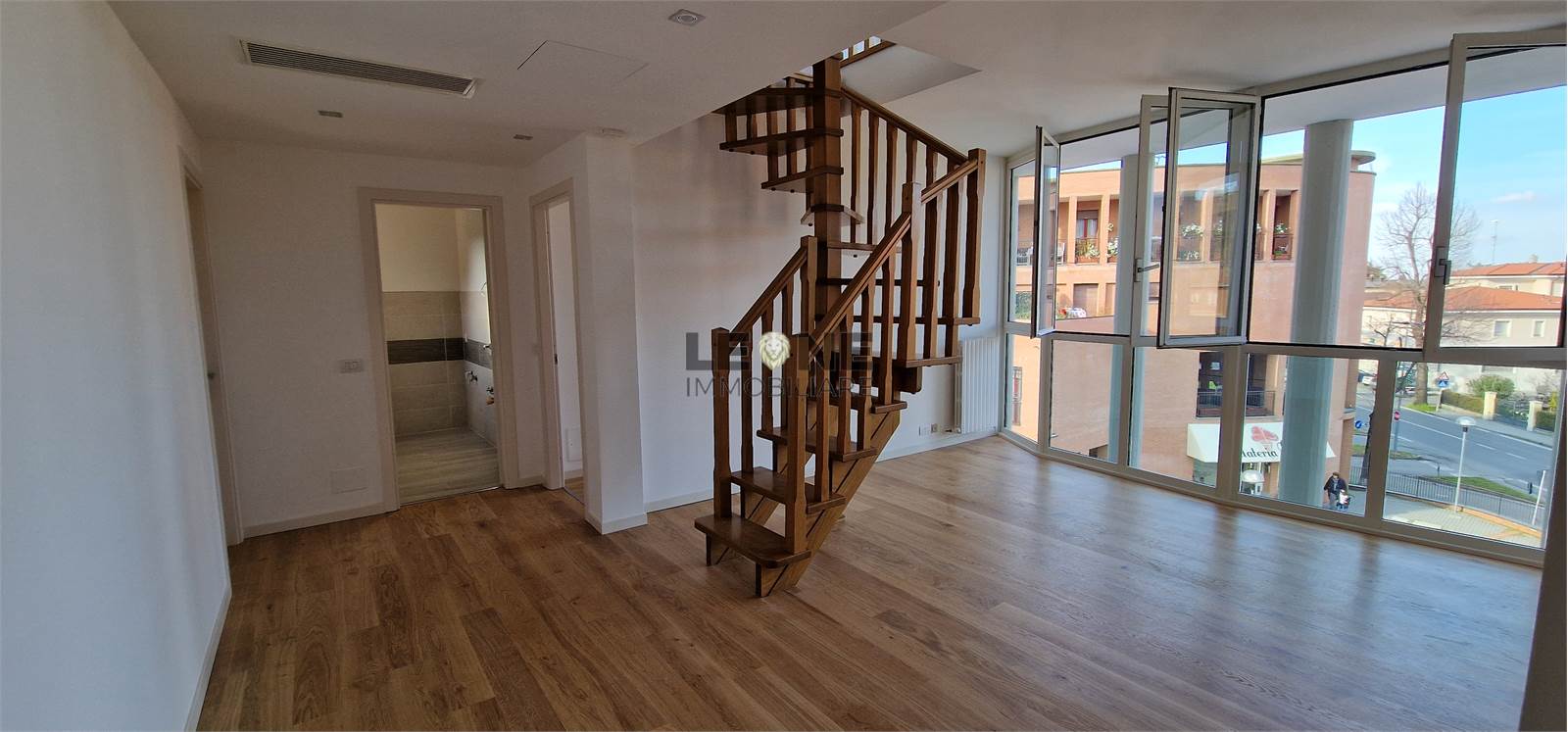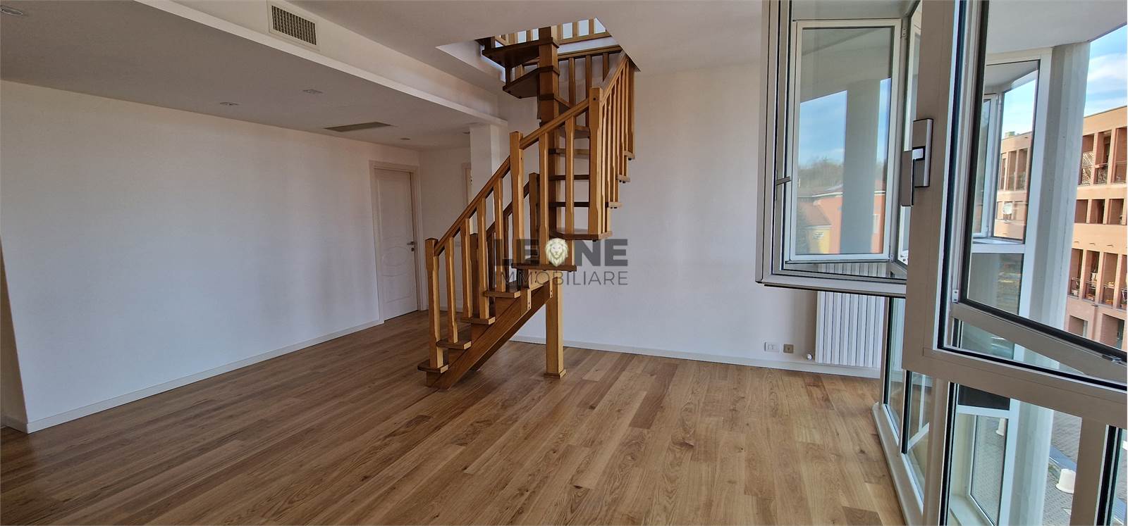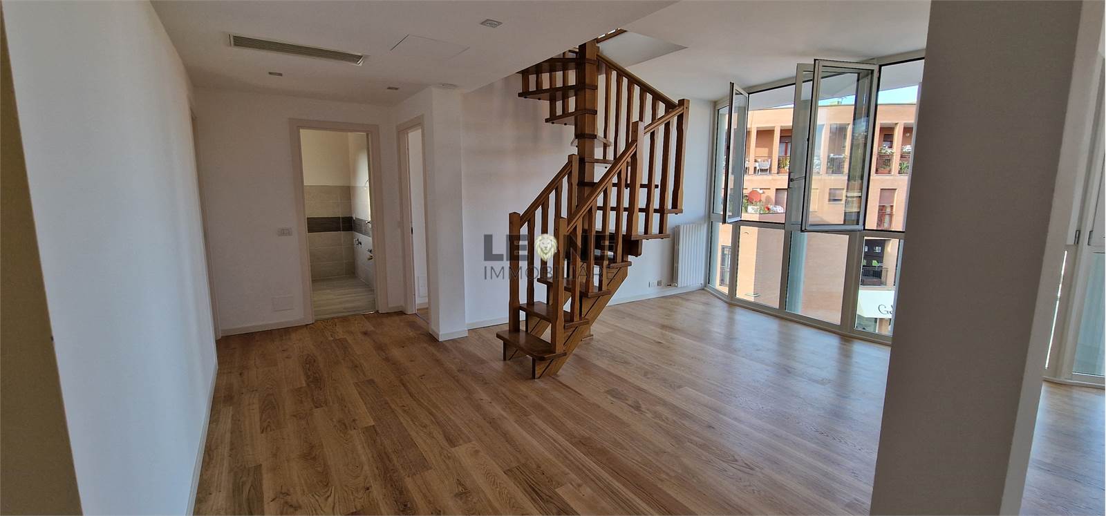 Importante zona giorno con soggiorno ampio e luminoso, valorizzato da grandi vetrate e accesso al balcone, cucina a vista, bagno, lavanderia/ripostiglio e scala in legno di collegamento al piano superiore.