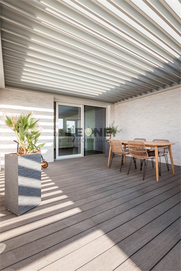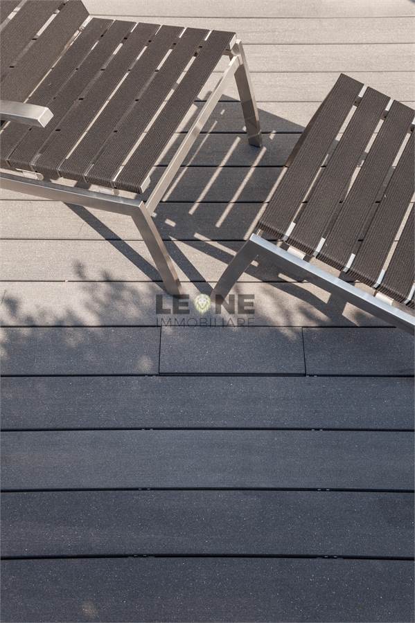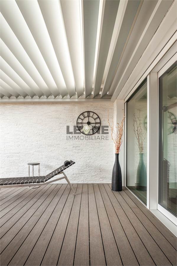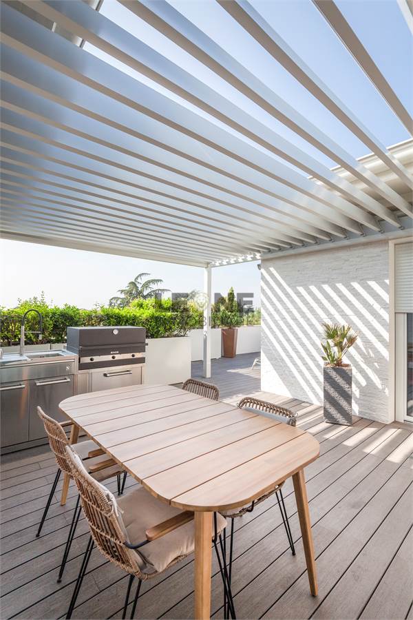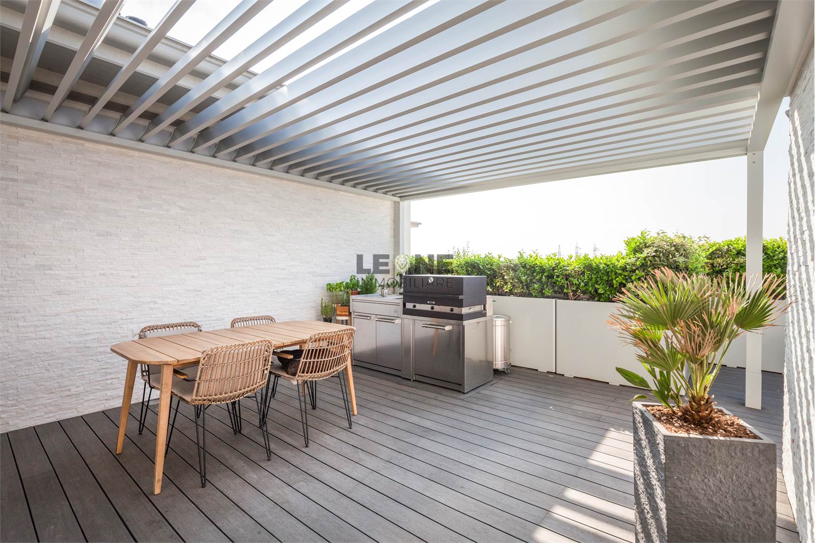 Ampio terrazzo completamente rivestito in listone di legno composito SILVADEC con perimetro completamente piantumato per la privacy. Angolo cottura cucina da esterno con grill, rivestimento estetico delle pareti in quarzite bianca, pergole bioclimatiche apribili.