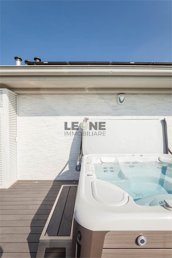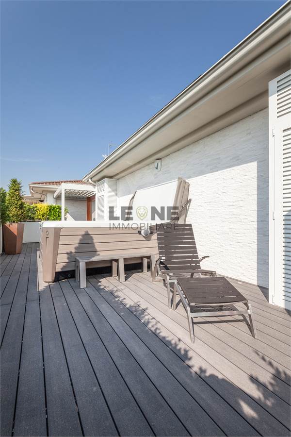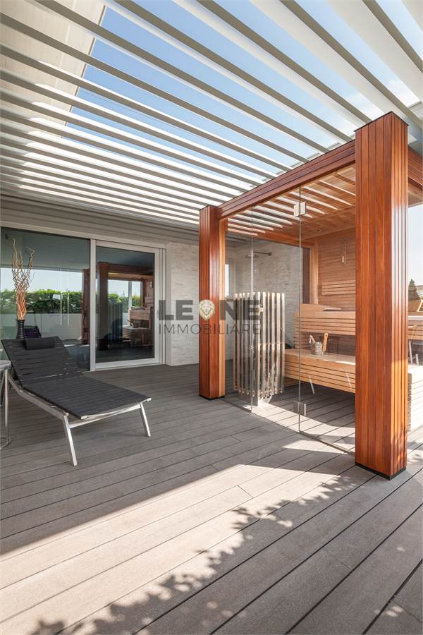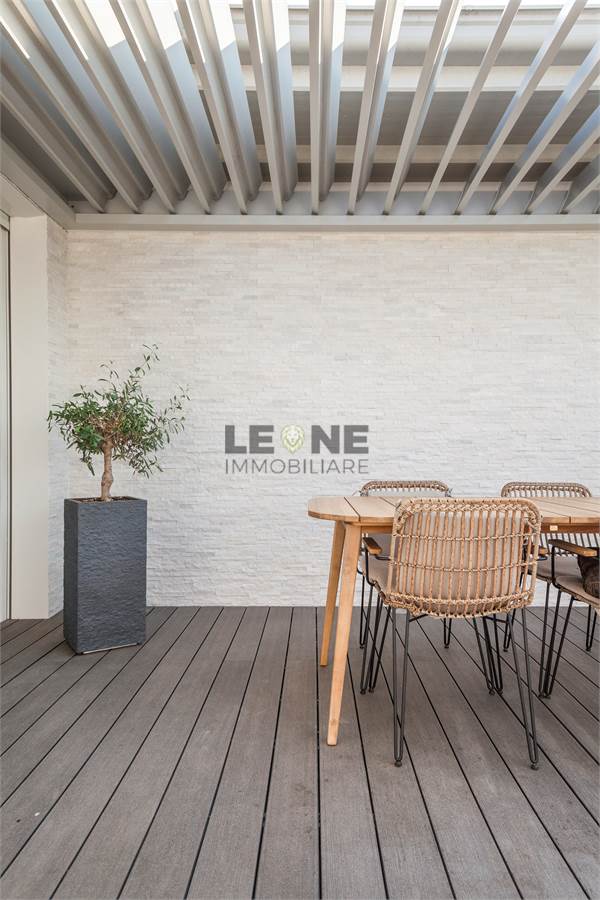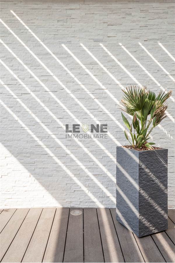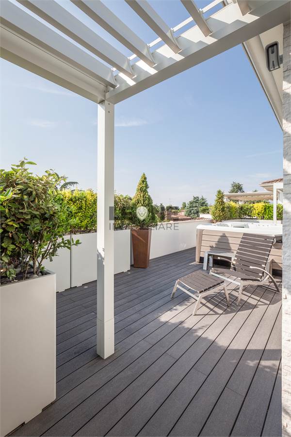 Ampio terrazzo completamente rivestito in listone di legno composito SILVADEC con perimetro completamente piantumato per la privacy. Angolo cottura cucina da esterno con grill, rivestimento estetico delle pareti in quarzite bianca, pergole bioclimatiche apribili.